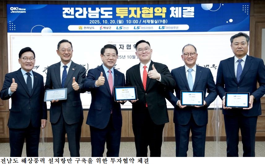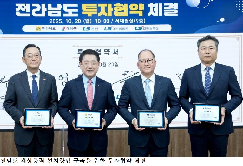 전라남도는 20일 도청 서재필실에서 국내 전선업계 1위 기업 ㈜LS전선의 자회사인 ㈜LS머트리얼즈, ㈜LS마린솔루션과 해상풍력 전용 설치항만 조성, 케이블 설치선 건조 등을 위한 투자협약을 했다.