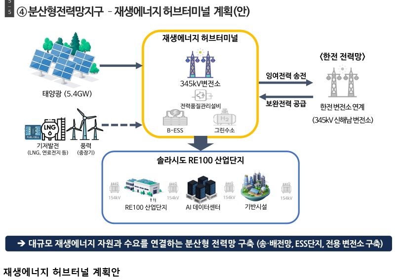 솔라시도 기업도시는 2030년까지 5.4GW 대규모 태양광을 개발, 송·배전망과 ESS단지, 전용 변전소 등을 갖춘 재생에너지 허브터미널을 통해 저렴한 재생에너지 전력을 첨단산업 및 AI데이터센터에 공급할 예정이다.