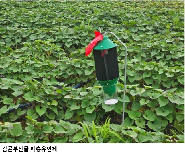 기존 페로몬 한 가지만 처리할 때보다 큰검정풍뎅이 유인·포획률은 약 45%(32.5→47.2마리) 향상됐다. 농가 2곳에서 실증한 결과, 고구마 피해율은 52%에서 15%로 37%포인트 감소했다.