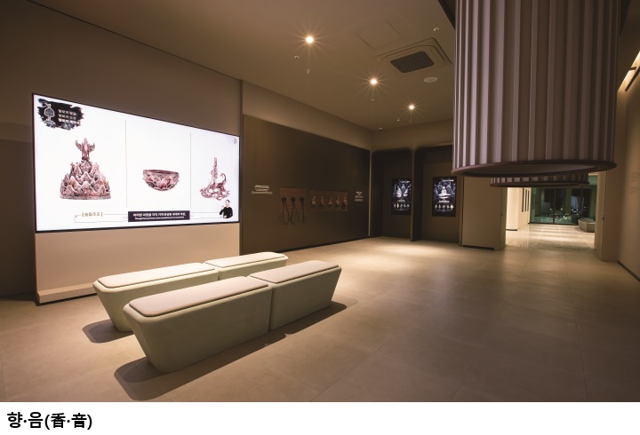 이 공간에는 소리와 향이 더해진다. 향로 뚜껑 위에 표현된 다섯 연주자의 악기 구성을 바탕으로 작곡한 음악이 흐르고, 고대 향료를 현대적으로 조향한 향기가 은은하게 퍼진다. 소리와 향은 시각적 감상을 보완하며, 관람객이 백제금동대향로의 미감과 정신세계를 오감으로 느끼도록 한다.