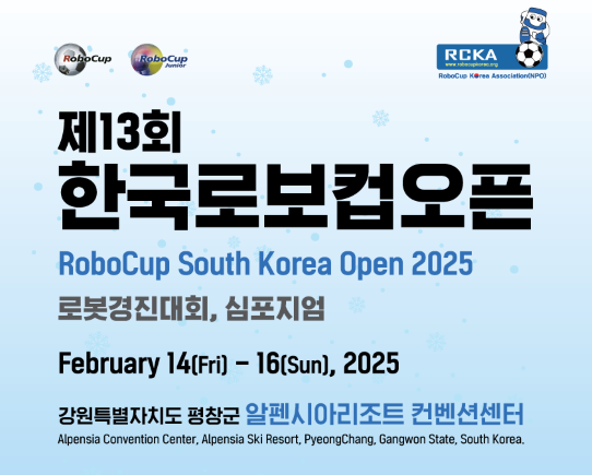 국내외 5개국 900여 명 참가, 로봇 기술과 인공지능 축제의 장 열려 강원관광재단(대표이사 최성현)은 제13회 한국 로보컵 오픈(RoboCup South Korea Open 2025, RCKO 2025)이 2월 15일(토) 평창 알펜시아 리조트에서 개막한다고 밝혔다. 한국로보컵협회와 로봇신문이 주최하고 평창군, 강원관광재단, 산업통상자원부, 한국로봇산업진흥원 등이 후원하는 이번 대회는 2월 15일 개막해 16일까지 이틀간 개최된다.