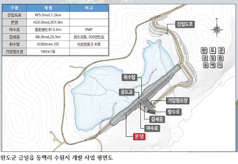 금일 동백리 수원지 개발 본격화...2027년 12월 준공 식수 전용 수원지 381,000㎥ 신설, 도수 관로 6.2km 등 설치 완도군은 이상기후로 인한 가뭄 피해를 겪었던 금일읍의 항구적인 대책을 마련하기 위해 「금일읍 동백리 수원지 개발 사업」을 추진한다. 총 사업비 440억 원을 투입, 식수 전용 수원지 381,000㎥, 도수 관로 6.2km, 가압장 1개소 등을 신설한다. 지난달 착공했으며, 2027년 12월 준공을 목표로 추진될 계획이다. 사업이 완료되면 기존의 척치, 용항제의 부족한 취수량에 대처하고 금일읍에 안정적인 생활용수를 공급할 수 있을 것으로 전망된다. 환경수질관리과 관계자는 “도서 지역 주민들이 물 부족으로 인한 불편함을 겪지 않도록 사업이 신속하고 원활하게 추진될 수 있도록 최선을 다하겠다”라고 말했다. |