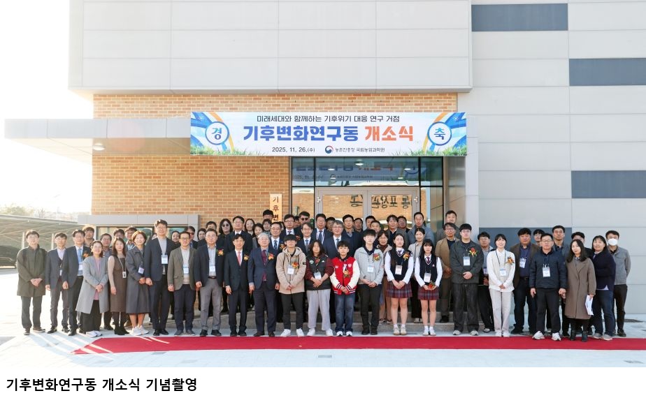 농업 분야 기후변화 연구하는 환경 조절 연구시설 중간 미래·먼 미래 기후변화 예측하고 대응 기술 개발에 활용 농촌진흥청(청장 이승돈)은 기후변화에 선제적으로 대응하고 지속 가능한 농업기술을 개발하기 위해 ‘기후변화연구동’을 준공하고, 11월 26일 국립농업과학원에서 개관식을 열었다. 기후변화연구동은 인공지능(AI) 기술을 이용해 기상‧기후를 예측하고 미래 기후 시나리오를 재현해 농업 분야 기후변화를 연구하는 환경 조절 연구시설이다. 미래, 2050년(중간 미래) 또는 2100년(먼 미래)의 온도, 습도, 이산화탄소 농도 등 기상 조건을 정밀하게 조절해 실제 기후변화가 농업에 미치는 영향을 예측하고 적응 기술을 개발하게 된다.