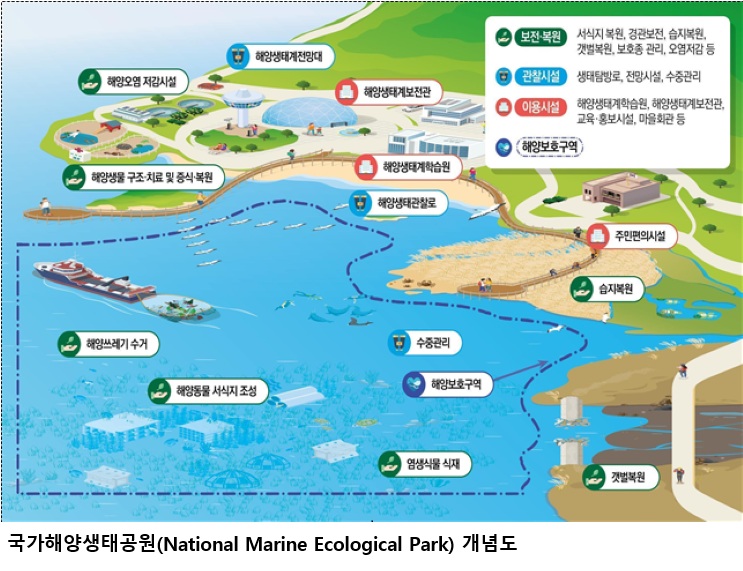 지역경제 활성화 거점 육성...해양 보전과 이용이 공존하는 복합관광 거점 만든다 충남 가로림만, 전남 여자만 등 국가해양생태공원, 2030년까지 방문객 1,000만 명 달성 목표 해양수산부(장관 전재수)는 국가해양생태공원의 지정과 체계적인 운영을 위해 관계부처 합동으로 「국가해양생태공원 지정・운영 추진전략」을 수립하고, 12월 2일(화) 경제관계장관회의에서 발표하였다고 밝혔다. 해양수산부는 유엔생물다양성협약(UN CBD)에서 정한 대로 2030년까지 관할 해역의 30%를 보호구역*으로 지정한다는 목표를 실현하기 위해 해양보호구역 확대를 추진하고 있으나, 개발 행위를 제한하는 소극적・규제적 관리 방식의 기존 정책으로는 보호구역 확대에 어려움이 있었다. * (해양에 지정된 보호구역) 총 9,191㎢, 우리나라 관할해역 대비 2.09% 규모(2025. 11. 기준) 특히, 최근 갯벌생태 체험 등 해양생태 관광에 대한 국민적 수요 증가*와 해양생태 자원을 활용해 관광객을 유치하고자 하는 지자체의 개발 요구**가 지속되고 있어 새로운 관점의 보전 정책이 필요한 상황이었다. * 보호구역 관광객 추이 : (2020) 210만 명 → (2021) 233만 명 → (2022) 279만 명 ** 호미반도 예비타당성 조사(2024. 11.~), 여자만 예비타당성조사 대상 사업 선정(2025. 11.) 이에, 해양수산부는 우수한 해양생태 자원의 합리적 이용을 통해 보전과 이용이 공존하는 해양생태계를 구현하기 위해 국가가 직접 지정하는 ‘국가해양생태공원 제도’를 도입*하였다. * 「해양생태계의 보전 및 관리에 관한 법률」 제43조의 2(국가해양생태공원의 지정) 신설 (2022. 12.) 이후 해양수산부는 「국가해양생태공원 지정・운영 추진전략」을 수립하여 해양자산 가치가 우수하고 사업계획이 구체화된 충남 가로림만, 전남 신안ㆍ무안, 전남 여자만, 경북 호미반도 4곳을 최초의 국가해양생태공원으로 지정하였다. ▲가로림만은 점박이물범이 서식하는 등 해양생물 다양성이 우수한 지역이고, ▲신안ㆍ무안 갯벌은 세계자연유산 등재지역이다. ▲여자만은 철새 도래지 등 환경적 가치가 우수한 지역이며, ▲호미반도는 게바다말 등 해양보호생물이 광범위하게 서식하는 동해안권 대표 보호구역이다. 이번에 지정하는 국가해양생태공원은 해양보호구역인 핵심보전구역과 완충구역*(해상 1km), 지속가능이용구역**(육상 500m)으로 구분하고, 3단계 공간관리체계를 도입하여 보전과 이용이 균형을 갖춘 공간으로 관리될 예정이다. * (완충구역) 해양환경 조사 및 연구, 해역관리 시행 ** (지속가능이용구역) 관찰시설, 보전관, 학습원 등 시설 설치 해양수산부는 경제관계장관회의 이후 해양수산발전위원회 심의를 거쳐 올해 안에 국가해양생태공원의 지정을 완료할 계획이다. 또한 ‘함께 누리는 해양생태계의 혜택, 국가해양생태공원’이라는 비전 아래 2030년까지 연간 방문객 1,000만 명 달성을 목표로 「국가해양생태공원 지정・운영 추진전략」을 차질 없이 추진할 계획이다.