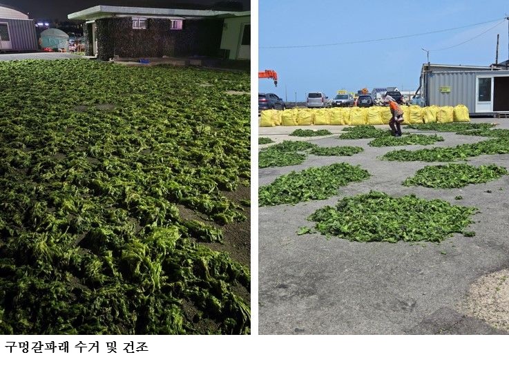 쓸모없는 구멍갈파래 전복 사료로 재탄생! 경제·환경문제까지 해결 국립수산과학원(원장 최용석, 이하 수과원)은 최근 제주도지역에서 골칫거리로 여겨지는 구멍갈파래를 전복 치패용 배합사료 원료로 활용하는 제조기술을 개발(국유특허)했다고 밝혔다. 구멍갈파래는 주로 여름철에 제주도 연안에 대량으로 발생하여 자연경관을 훼손하고, 악취 발생 등의 문제를 유발하고 있어서 매년 구멍갈파래의 수거와 처리에 막대한 비용*이 발생하고 있다. *구멍갈파래 수거량(제주, ‘20~’24): 2만 2천여 톤, 처리 비용: 2억여 원/년 수과원 사료연구센터는 2023년부터 구멍갈파래를 활용하여 전복 치패용 배합사료 개발 연구를 수행해 왔다. 그 결과 전복 사료의 주요 원료인 저가의 수입 미역분말(사료 내 30%)을 100% 대체 가능한 것으로 확인되었고, 생산단가* 기준으로 25.6%의 원가** 절감 효과가 있는 것으로 나타났다. *원료 가격: 미역분말(중국산 3,500원/kg, 국내산 6,000원/kg), 구멍갈파래(2,000원/kg) **사료 원가: 일반사료(45,760원/20kg), 구멍갈파래 사료(34,060원/20kg) 또한, 최근에는 구멍갈파래 전복 치패용 배합사료가 양식 현장에서 활용될 수 있도록 전복 생산자 협회와 함께 현장 실증시험을 진행하였고, 현장의 의견을 수렴하여 사료회사에 기술이전을 추진할 예정이다. 최용석 수과원장은 “구멍갈파래의 사료원료화는 환경을 개선함과 동시에 전복 생산단가를 낮추어 어업인의 소득증대에 도움이 될 것으로 기대한다”라고 하였으며, “향후 폐기되는 물김 등 버려지는 해조류를 활용한 연구를 지속적으로 수행할 것이다”라고 말했다. |