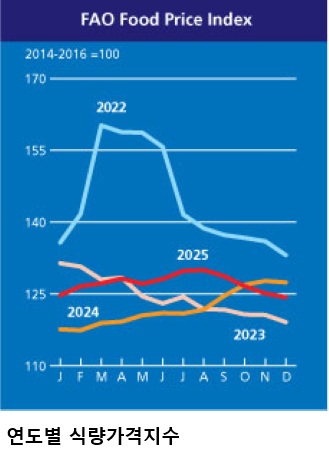 κ°κ²©νλ½... μ μ§λ₯(β³0.2%), μ μ ν(β³4.4%), μ‘λ₯(β³1.3%) κ°κ²©μμΉ... 곑물(1.7%), μ€ν(2.4%) μ μ μλλμ 기ꡬ(FAO)*μ λ°λ₯΄λ©΄, 2025λ 12μ μΈκ³μλκ°κ²©μ§μλ μ μ(125.1ν¬μΈνΈ) λλΉ 0.6% νλ½ν 124.3ν¬μΈνΈ**λ₯Ό κΈ°λ‘νμλ€. νλͺ©κ΅°λ³λ‘ μ μ§λ₯, μ μ ν, μ‘λ₯ κ°κ²©μ νλ½νκ³ κ³‘λ¬Ό, μ€ν κ°κ²©μ μμΉνμλ€. * μ μ μλλμ 기ꡬλ 24κ° νλͺ©μ λν κ΅μ κ°κ²©λν₯(95κ°)μ μ‘°μ¬νμ¬, 5κ° νλͺ©κ΅°(곑물, μ μ§λ₯, μ‘λ₯, μ μ ν, μ€ν)λ³ μλκ°κ²©μ§μλ₯Ό λ§€μ μμ±, λ°ν(2014~2016λ νκ· =100) ** (β25.8μ) 130.0 β (9μ) 128.6 β (10μ) 126.5 β (11μ) 125.1 β (12μ) 124.3