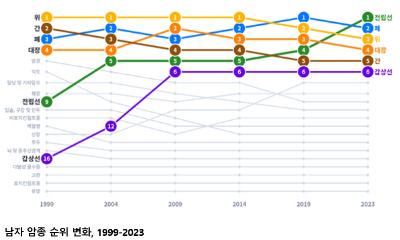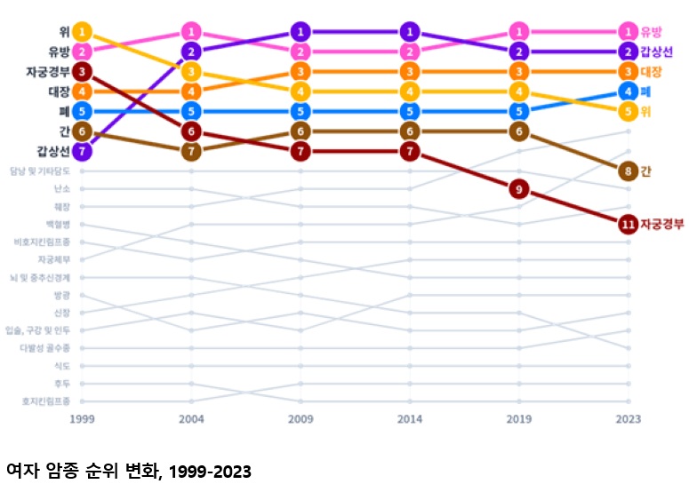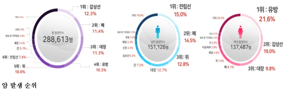 ๊ตญ๋ฏผ 19๋ช ์ค 1๋ช ์ โ์์ ๋ณ์โ, ์ ๊ท ์ํ์ ์ ๋ฐ ์ด์(50.4%)์ 65์ธ ์ด์(๊ณ ๋ น์) ์ ๋ฆฝ์ ์ ํต๊ณ ๊ณตํ ์ด๋ ์ต์ด ๋จ์ฑ์ 1์๋ก ๋ณด๊ฑด๋ณต์ง๋ถ(์ฅ๊ด ์ ์๊ฒฝ)์ ์ค์์๋ฑ๋ก๋ณธ๋ถ(๊ตญ๋ฆฝ์์ผํฐ, ์์ฅ ์ํ๊ด)๋ ์๋ฑ๋กํต๊ณ์ฌ์ ์ ํตํด ์์ง๋ ์ฐ๋ฆฌ๋๋ผ์ 2023๋ ๊ตญ๊ฐ์๋ฑ๋กํต๊ณ๋ฅผ ๋ฐํํ์๋ค. ๊ตญ๊ฐ์๋ฑ๋กํต๊ณ๋ใ์๊ด๋ฆฌ๋ฒใ์ 14์กฐ์ ๊ทผ๊ฑฐํ์ฌ ๋งค๋ ์๋ฃ๊ธฐ๊ด์ ์ง๋ฃ๊ธฐ๋ก์ ๋ฐํ์ผ๋ก ์ํ์์ ์๋ฃ๋ฅผ ์์งโง๋ถ์ํ๋ค. 2๋ ์ ์ ๋ฐ์๋ฅ , ์ ์์กด์จ, ์ ์ ๋ณ๋ฅ ๋ฑ์ ์๋ฑ๋กํต๊ณ๋ฅผ ์ฐ์ถํ๊ณ ์์ผ๋ฉฐ, ์ด๋ ๊ตญ๊ฐ ์๊ด๋ฆฌ ์ ์ฑ ์๋ฆฝ ๋ฐ ๊ตญ์ ๋น๊ต์ ๊ทผ๊ฑฐ์๋ฃ๋ก ํ์ฉ๋๋ค. 2023๋ ๊ตญ๊ฐ์๋ฑ๋กํต๊ณ์ ์ฃผ์ ๋ด์ฉ์ ๋ค์๊ณผ ๊ฐ๋ค. 2023๋ ์ ๊ท ๋ฐ์ํ ์ํ์ ์๋ 28๋ง 8,613๋ช (๋จ 15๋ง 1,126๋ช , ์ฌ 13๋ง 7,487๋ช )์ผ๋ก ์ ๋ ๋๋น 7,296๋ช (2.5%) ์ฆ๊ฐํ์๊ณ , ์ํต๊ณ๊ฐ ์ฒ์์ผ๋ก ์ง๊ณ๋ 1999๋ 10๋ง 1,854๋ช ์ ๋นํด 2.8๋ฐฐ ์ฆ๊ฐํ์๋ค. * ์ํ์ ์: (โ99) 101,854๋ช โ (โ10) 208,458๋ช โ (โ22) 281,317๋ช โ (โ23) 288,613๋ช ์ธ๊ตฌ ๊ตฌ์กฐ์ ๋ณํ๋ฅผ ๋ฐฐ์ ํ๊ณ ์ฐ์ถํ ์ฐ๋ นํ์คํ๋ฐ์๋ฅ (์ดํโ๋ฐ์๋ฅ โ์ด๋ผ ํ๋ค)์ ์ธ๊ตฌ 10๋ง ๋ช ๋น 522.9๋ช ์ผ๋ก ์ต๊ทผ ์ ์ฒด ์์์ ๋ณด์๋ค. ์ด๋ ์ต๊ทผ ์ ๊ท ์ํ์ ์์ ์ฆ๊ฐ๋ ์ธ๊ตฌ ๊ณ ๋ นํ์ ๋ฐ๋ฅธ ๊ฒฐ๊ณผ๋ก ํด์ํ ์ ์๋ค. * ์ธ๊ตฌ 10๋ง ๋ช ๋น ๋ฐ์๋ฅ : (โ20) 489.5๋ช โ (โ21) 531.4๋ช โ (โ22) 521.3๋ช โ (โ23) 522.9๋ช ์ฑ๋ณ ์ ๋ฐ์๋ฅ ์ ๋จ์ 587.0๋ช , ์ฌ์ 488.9๋ช ์ด์๋ค. * ๋จ์ ์ ๋ฐ์๋ฅ : (โ20) 571.3๋ช โ (โ21) 601.9๋ช โ (โ22) 590.3๋ช โ (โ23) 587.0๋ช * ์ฌ์ ์ ๋ฐ์๋ฅ : (โ20) 441.8๋ช โ (โ21) 494.1๋ช โ (โ22) 484.2๋ช โ (โ23) 488.9๋ช ์ฐ๋ฆฌ๋๋ผ ๊ตญ๋ฏผ์ด ํ์ ๋์ ์์ด ๋ฐ์ํ ํ๋ฅ ์ด ๋จ์๋ ์ฝ 2๋ช ์ค 1๋ช (44.6%), ์ฌ์๋ ์ฝ 3๋ช ์ค 1๋ช (38.2%)์ผ๋ก ์ถ์ ๋์๋ค. * ํ์ฌ์ ์ ๋ฐ์๋ฅ ์ด ์์ผ๋ก ๊ณ์ ์ ์ง๋๋ค๊ณ ๊ฐ์ ํ ๋ ํ์ ์์ด ๋ฐ์ํ ํ๋ฅ 2023๋ ๋จ๋ ์ ์ฒด์์ ๊ฐ์ฅ ๋ง์ด ๋ฐ์ํ ์์ ๊ฐ์์ ์์ด์์ผ๋ฉฐ, ์ด์ด์ ํ์, ๋์ฅ์, ์ ๋ฐฉ์, ์์, ์ ๋ฆฝ์ ์, ๊ฐ์ ์์ด์๋ค. ํนํ ์ธ๊ตฌ์ ๊ณ ๋ นํ ํจ๊ณผ๋ก ์ ๋ฆฝ์ ์์ด ๋จ์ฑ์ 1์๊ฐ ๋์๋ค. * (๋จ์ ์ ๋ฐ์ ์์) ์ ๋ฆฝ์ ์((โ22) 2์) โ ํ์((โ22) 1์) โ ์์ โ ๋์ฅ์ โ ๊ฐ์ - ๊ฐ์์ ์ ์ * (์ฌ์ ์ ๋ฐ์ ์์) ์ ๋ฐฉ์ โ ๊ฐ์์ ์ โ ๋์ฅ์ โ ํ์ โ ์์ - ์ท์ฅ์ ์ ์ ์ง๋จ ์ ์กฐ๊ธฐ์ ์ง๋จ(๊ตญํ)๋ ๋ถ์จ์ 2023๋ 51.8%๋ก ์์ฝ๋ณ๊ธฐ๊ฐ ์์ง๋๊ธฐ ์์ํ 2005๋ ์ ๋นํด 6.2%p ์ฆ๊ฐํ ๋ฐ๋ฉด, ์๊ฒฉ์ ์ด๋ ํ์์ ๋ถ์จ์ 2.5%p((`05)21.3%->(`23)18.8%) ๊ฐ์ํ๋ค. ๊ตญ๊ฐ์๊ฒ์ง์ฌ์ ๋์ ์์ข ์ธ 6๋์(์์, ๋์ฅ์, ๊ฐ์, ํ์, ์ ๋ฐฉ์, ์๊ถ๊ฒฝ๋ถ์)์ ์กฐ๊ธฐ์ง๋จ(๊ตญํ) ๋ถ์จ์ ์์ 18.8%p, ์ ๋ฐฉ์ 10.0%p, ํ์ 9.6%p ์์ผ๋ก ์ฆ๊ฐํ์๋ค. 2023๋ ๋จ๋ ์ ์ฒด์์ ์ฐ๋ น๋๋ณ๋ก ๊ฐ์ฅ ๋ง์ด ๋ฐ์ํ ์์ 0~9์ธ๋ ๋ฐฑํ๋ณ, 10๋ยท20๋ยท30๋๋ ๊ฐ์์ ์, 50๋๋ ์ ๋ฐฉ์, 60๋ยท70๋ยท80์ธ ์ด์์์๋ ํ์์ด์๋ค. ์ฑ๋ณ๋ก ๋๋ ์ ๋ณด๋ฉด ๋จ์์์๋ 0~9์ธยท10๋ ๋ฐฑํ๋ณ, 20๋ยท30๋ยท40๋ ๊ฐ์์ ์, 50๋ ๋์ฅ์, 60๋ยท70๋ ์ ๋ฆฝ์ ์, 80์ธ ์ด์์ ํ์์ด ๊ฐ์ฅ ๋ง์๋ค. ์ฌ์์์๋ 0~9์ธ ๋ฐฑํ๋ณ, 10๋ยท20๋ยท30๋ ๊ฐ์์ ์, 40๋ยท50๋ยท60๋ ์ ๋ฐฉ์, 70๋ ํ์, 80์ธ ์ด์์ ๋์ฅ์์ด ๊ฐ์ฅ ๋ง์๋ค. โฒ ์ฐ๋ น๋๋ณ ์์ฃผ ๋ฐ์ํ๋ ์์ข ํํฉ