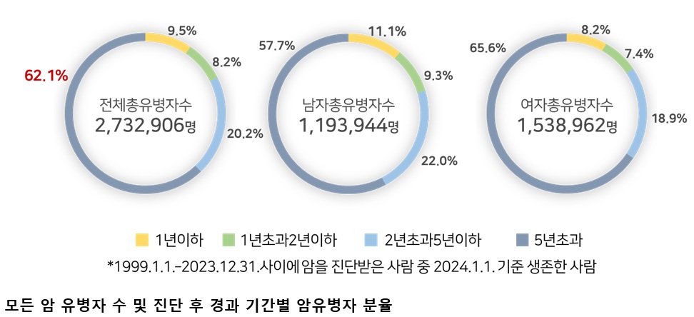 2023๋ ์ ๊ท ๋ฐ์ํ 65์ธ ์ด์ ๊ณ ๋ น ์ํ์ ์๋ 14๋ง 5,452๋ช (๋จ 9๋ง 62๋ช , ์ฌ 5๋ง 5,390๋ช )์ผ๋ก ์ ์ฒด ์ํ์์ 50.4%๋ฅผ ์ฐจ์งํ์๋ค. 65์ธ ์ด์ ๋จ๋ ์ ์ฒด์์ ๊ฐ์ฅ ๋ง์ด ๋ฐ์ํ ์์ ํ์์ด์์ผ๋ฉฐ, ์ด์ด์ ์ ๋ฆฝ์ ์, ์์, ๋์ฅ์, ๊ฐ์ ์์ด์๋ค. * (65์ธ ์ด์ ๋จ์ ์ ๋ฐ์ ์์) ์ ๋ฆฝ์ ์ โ ํ์ โ ์์ โ ๋์ฅ์ โ ๊ฐ์ ์ * (65์ธ ์ด์ ์ฌ์ ์ ๋ฐ์ ์์) ๋์ฅ์ โ ํ์ โ ์ ๋ฐฉ์ โ ์์ โ ์ท์ฅ์ ์ต๊ทผ 5๋ (โ19~โ23) ์ง๋จ๋ฐ์ ์ํ์์ 5๋ ์๋์์กด์จ*(์ดํโ์์กด์จโ์ด๋ผ ํ๋ค)์ 73.7%๋ก, ์ํ์ 10๋ช ์ค 7๋ช ์ 5๋ ์ด์ ์์กดํ๋ ๊ฒ์ผ๋ก ๋ณผ ์ ์๋ค. * ์ํ์์ ๊ด์ฐฐ์์กด์จ์ ๋์ผํ ์ฑ๋ณ, ์ฐ๋ น๊ตฐ์ ๊ฐ์ง๋ ์ผ๋ฐ์ธ๊ตฌ์ ๊ธฐ๋์์กด์จ๋ก ๋๋์ด ๊ตฌํ ๊ฐ์ผ๋ก ์ผ๋ฐ์ธ๊ณผ ๋น๊ตํ์ฌ ์ํ์๊ฐ 5๋ ๊ฐ ์์กดํ ํ๋ฅ ์ ์๋ฏธ 5๋ ์์กด์จ์ ์ง์์ ์ผ๋ก ์ฆ๊ฐํ์ฌ, 2001~2005๋ ์ ์ง๋จ๋ฐ์ ์ํ์์ ์๋์์กด์จ(54.2%)๊ณผ ๋น๊ตํ ๋ 19.5%p ๋์์ก๋ค. ์ฑ๋ณ 5๋ ์์กด์จ์ ์ฌ์(79.4%)๊ฐ ๋จ์(68.2%)๋ณด๋ค ๋์๋๋ฐ, ์ด๋ ์์กด์จ์ด ๋์ ๊ฐ์์ ์, ์ ๋ฐฉ์์ด ์ฌ์์๊ฒ ๋ ๋ง์ด ๋ฐ์ํ๊ธฐ ๋๋ฌธ์ผ๋ก ๋ถ์๋๋ค. ๊ฐ์์ ์(100.2%), ์ ๋ฆฝ์ ์(96.9%), ์ ๋ฐฉ์(94.7%)์ด ์์ข ์ค์์ ๋์ ์์กด์จ์ ๋ณด์๊ณ , ํ์(42.5%), ๊ฐ์(40.4%), ์ท์ฅ์(17.0%)์ ์๋์ ์ผ๋ก ๋ฎ์ ์์กด์จ์ ๋ณด์ฌ ์ง์์ ์ธ ์ฐ๊ตฌ์ ๊ด๋ฆฌ ๊ฐํ๊ฐ ํ์ํ ์์ญ์ผ๋ก ๋ํ๋ฌ๋ค. 2001-2005๋ ๋๋น 2019-2023๋ ์ ์์กด์จ์ด ํฌ๊ฒ ์์นํ ์์ข ์ ํ์(25.9%p ์ฆ๊ฐ), ์์(20.6%p), ๊ฐ์(19.8%p)์ด์๋ค ์กฐ๊ธฐ์ ์ง๋จ(๊ตญํ)๋ ์ํ์์ ์์กด์จ์ 92.7%์ธ ๋ฐ๋ฉด, ์๊ฒฉ์ ์ด๋ก ์ง๋จ๋ ํ์๋ ์์กด์จ์ด 27.8%๋ก ๋ฎ์ ์กฐ๊ธฐ์ง๋จ์ ์ค์์ฑ์ ์ ์ ์์๋ค. ์ด ์๊ฒฌ์ 0๊ฐ ๋ฑ๋ก๋ ๋๊ธ์ด ์์ต๋๋ค.