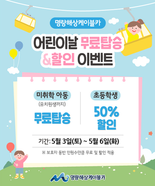 이런 지자체 행사와 더불어 해남과 진도의 대표 관광지인 명량해상케이블카에서도 어린이날을 맞이하여 어린이 관광객들을 위한 깜짝 선물을 준비했는데, 5월 3일부터 6일까지 연휴기간동안 명량해상케이블카를 방문하는 미취학 아동들에게는 케이블카를 무료로 탑승 및 초등학생에게는 기존 요금에서 50% 할인된 금액으로 케이블카를 이용할 수 있다.
