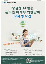 12일까지 AI 활용 온라인 마케팅 교육을 희망하는 농업인 30명 모집12월 중 마케팅 전략, 생성형 AI 활용 상세페이지 제작 등 이론·실습 병행 경기도농업기술원은 오는 12일까지 ‘생성형 AI 활용 온라인 마케팅 역량강화 교육’에 참여할 농업인 30명을 모집한다. 교육은 12월 5일과 10일 이틀간 농업기술원 내 정보화교육장에서 진행되며, 약 10시간 동안 ▲AI를 활용한 마케팅 전략수립 ▲온라인 마케팅을 위한