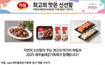 17・18코스 종점에서 ‘직화 닭목살 구이’, ‘닭발편육’ 활용한 세트 메뉴 판매이벤트 부스 마련해 하림몰 상품권, 이색 굿즈 등 경품 제공 수익금 전액 마을 부녀회에 기부... 종합식품기업 ㈜하림이 ‘2025 제주올레걷기축제’에 제품을 후원하고, 지역 주민들과 함께 올레꾼들에게 특별한 닭고기 요리를 선보인다. ‘제주올레걷기축제’는 하루 한 코스씩 제주올레 길을 걸으며 아름다운 제주의 자연을 만끽하고, 문화・예술 공