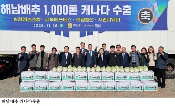 캐나다 H-마트 주요매장 공급, 26일 40톤 첫 선적 해남배추가 캐나다 수출길에 올랐다. 해남군은 26일 산이면 성장영농조합법인에서 캐나다로 수출될 해남배추 선적식을 가졌다. 이번에 선적된 물량은 40톤이며 내년 3월까지 총 1,000톤이 캐나다 토론토와 벤쿠버의 H-마트 주요매장에 공급될 예정이다. 선적식에는 명현관 해남군수와 이성옥 해남군의회 의장, 전남도 신현관 국제협력관, 김성일 도의원 등 관계자와