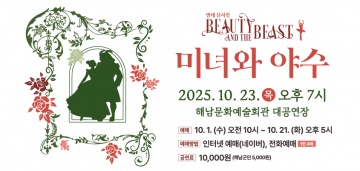 발레와 뮤지컬이 만난 감동무대, 10월 23일 군 문화예술회관 해남군은 오는 10월 23일 오후 7시 해남문화예술회관 대공연장에서 발레뮤지컬 ‘미녀와 야수’공연을 선보인다. 이번 공연은 인천시티발레단이 디즈니의 명작 동화‘미녀와 야수’를 바탕으로 국내에서 유일하게 발레와 뮤지컬을 결합해 연출한 무대로, 마법에 걸려 야수가 된 왕자 안토니오와 아버지를 대신해 야수의 포로가 된 미녀 벨의 이야기를 감동적으로 담아낸다.