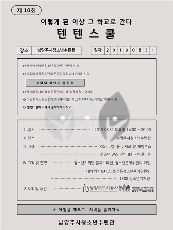 2019년 남양주시 청소년 텐텐 페스티벌 개최“이렇게 된 이상 그 학교로 간다. <텐텐스쿨>” 남양주도시공사에서 수탁 운영하고 있는 남양주시청소년수련관에서 8월 31일 토요일 14시부터 20시까지 2019년 남양주시 청소년 텐텐 페스티벌(이하 텐텐 페스티벌)을 개최한다. 올해로 10회를 맞은 텐텐 페스티벌은 관내‧외 청소년 및 시민들을 대상으로 남양주시청소년수련관 소속 자치단체인 청소년기획단(블